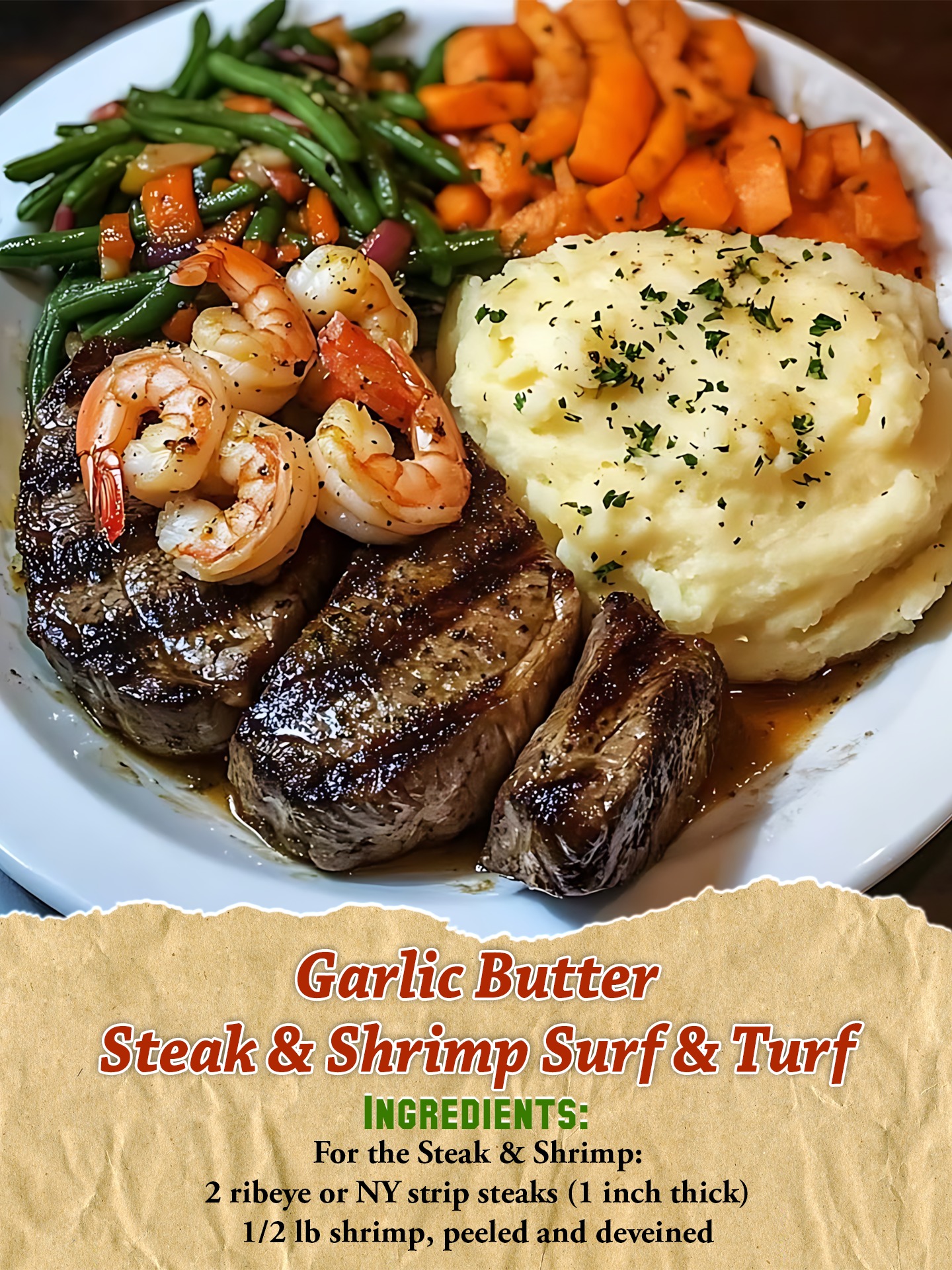 Plate the mashed potatoes, then top the steak with shrimp. Add the sautéed veggies to the side. Spoon over extra garlic butter from the pan and sprinkle with chopped parsley.