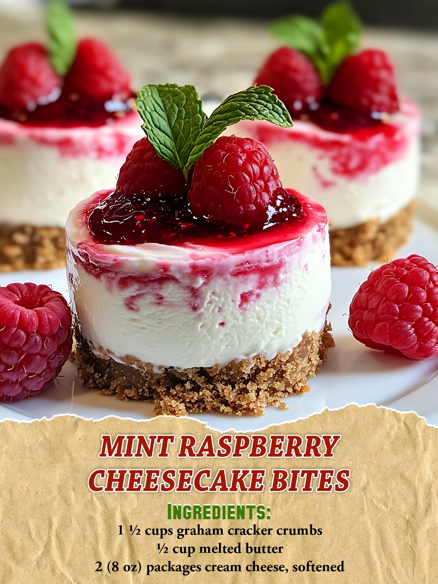 Melt raspberry preserves and spoon over each cheesecake. Top with raspberries.